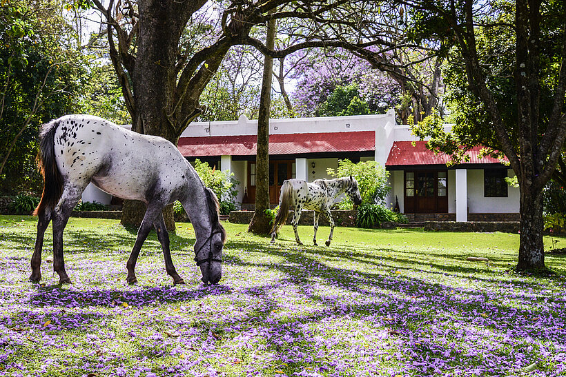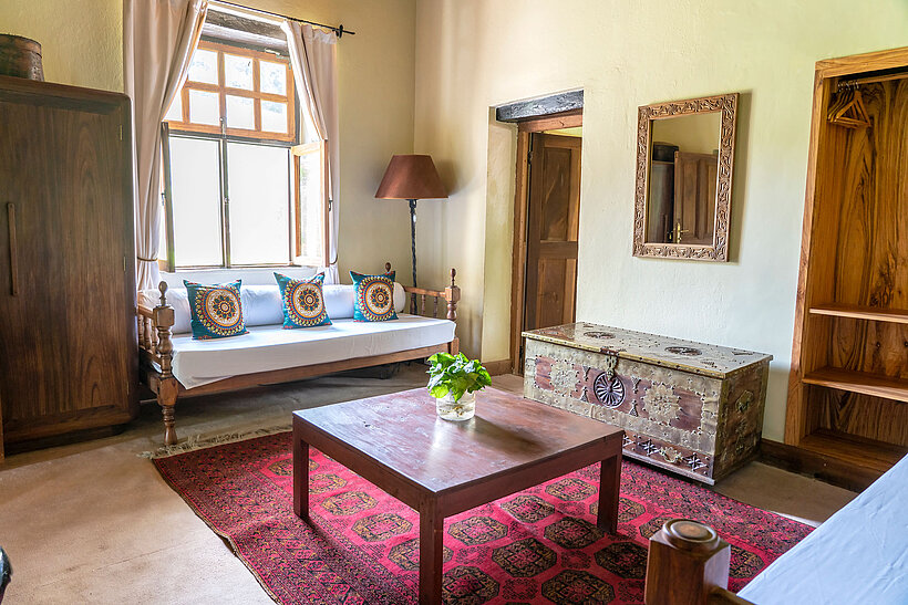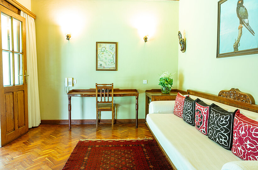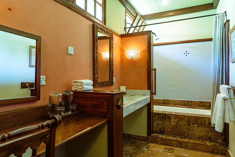 Suites are located on the first floor of the Main House. Each room is equipped with a king-size double bed, a separate lounge area with two large ottoman sofas that can be turned into single beds. A spacious bathroom has a separate toilet, a shower and a bathtub. These rooms share a generous veranda with spectacular views of Mount Kilimanjaro.