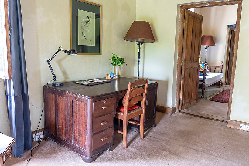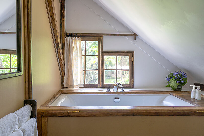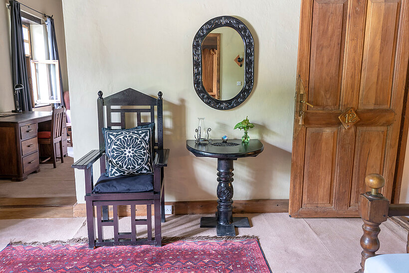 Seating at the East dormer window has spectacular views onto Mount Kilimanjaro, the forest reserve and lake. The living and dining area is furnished with antiques and oriental carpet. Each suite has a king size bed an Ottoman bed and dressing alcove. The bathrooms have a bath-with-a-view and walk-in shower.